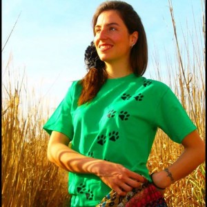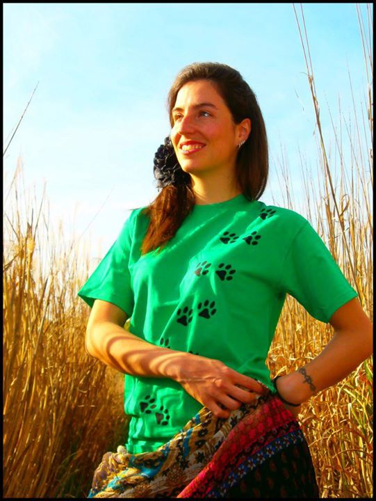 Camiseta Huellas. Color verde o rojo. Tallas S-M-XL